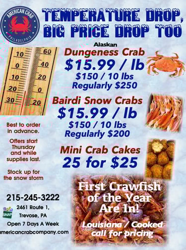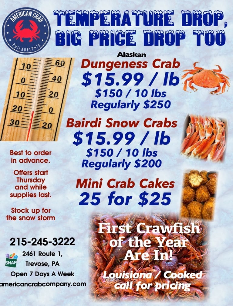 Save $10 at $15.99 a pound on Alaskan Dungeness crabs or go big with 10 lbs for just $150.00! That's a savings of $100 off the usual price for 10 lbs. Plus save on the best Snow Crabs, Bairdi on Sale for just $15.99 a pound. And we still have our customer favorite Mini Crab Cakes on sale - 25 for $25. And yes, we just got our first Louisiana Crawfish. Call for pricing. We recommend calling your orders in advance to ensure convenient pick up. 215-245-3222.